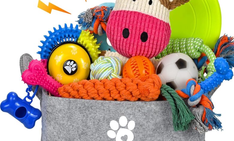 Affordable, enriched puppy toy set: 21-piece puppy toy set contains 7 dog rope toys, 3 rubber puppy chew toys, 2 plush squeaky dog toys, 1 soft squeaky football, 1 treat ball, 1 flight disc, 1 training bell, 3 rolls of dog waste bags, 1 waste bag dispenser & 1 foldable square dog toy box for organisation