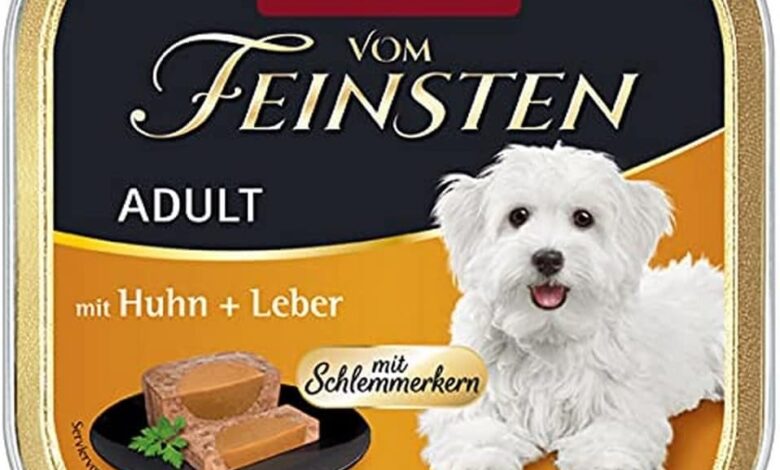 From the finest adult gourmet core with chicken and liver. The finest adult with gourmet core stands for balanced, delicious healthy diet at the highest level for adult dogs from 1 – 6 years. The quality of the meat raw materials combined with a core of selected gourmet ingredients guarantee a unique enjoyment. The finely chopped pies provide the adult dog with all vital nutrients. For adult dogs: The high-quality food is tailored to the needs of adult dogs. Real, honest meat taste: Thanks to the optimal workmanship, the door meat taste that dogs love is preserved. Gentle processing: thanks to the gentle and fresh processing of the ingredients, the door fibre structure of the meat is largely preserved. For 100% fresh, meaty ingredients in wet food. No additives: the dog moisture contains neither flavour enhancers, artificial colours and preservatives, nor soy and sugar and is also free from cereals. Made in Germany: according to current scientific findings made in Germany. Composition: 56% meat and animal derivatives (27% chicken, 12% liver, pork, beef), minerals alytic components: protein 9%, fat content 6%, crude fibre 0.4%, crude ash 2%, moisture 82%, nutritional additives: 130 IU 3a671, 0.0. 8 mg 3b406, 22 mg 3b605, 1.4 mg 3b503, 0.35 mg 3b202. Feeding recommendation: weight of the dog / g per day; 2 – 3 kg / 200 – 270 g; 4 – 6 kg / 340 – 450 g; 9 – 12 kg / 6 000 – 7 50 g