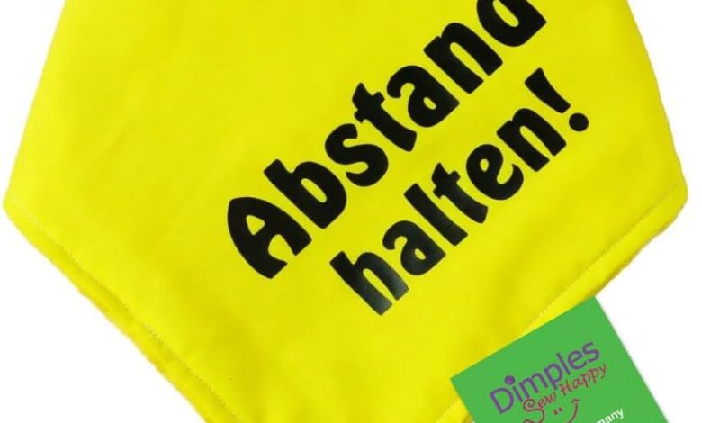 Dimples Yellow Dog Bandana – “Abstand halten” (German language) – keep a distance – please don’t touch the dog – warning scarf for small, medium and large dogs that are nervous, anxious, in heat, biting or in training (customisable)