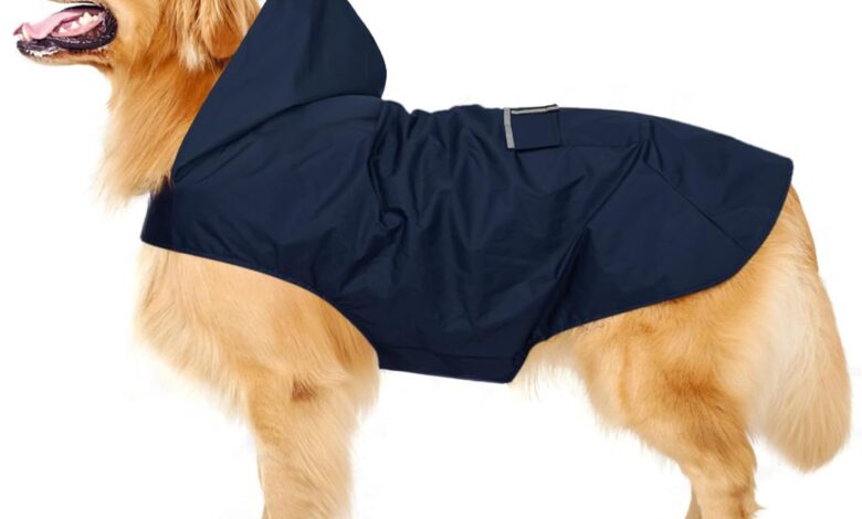 Dog traction rope hole and safety design for night use: Contains the belt access holes on the upper back for harness strap users. The hood and back reflector strips ensure that the animal can be seen in traffic during a rainy night.