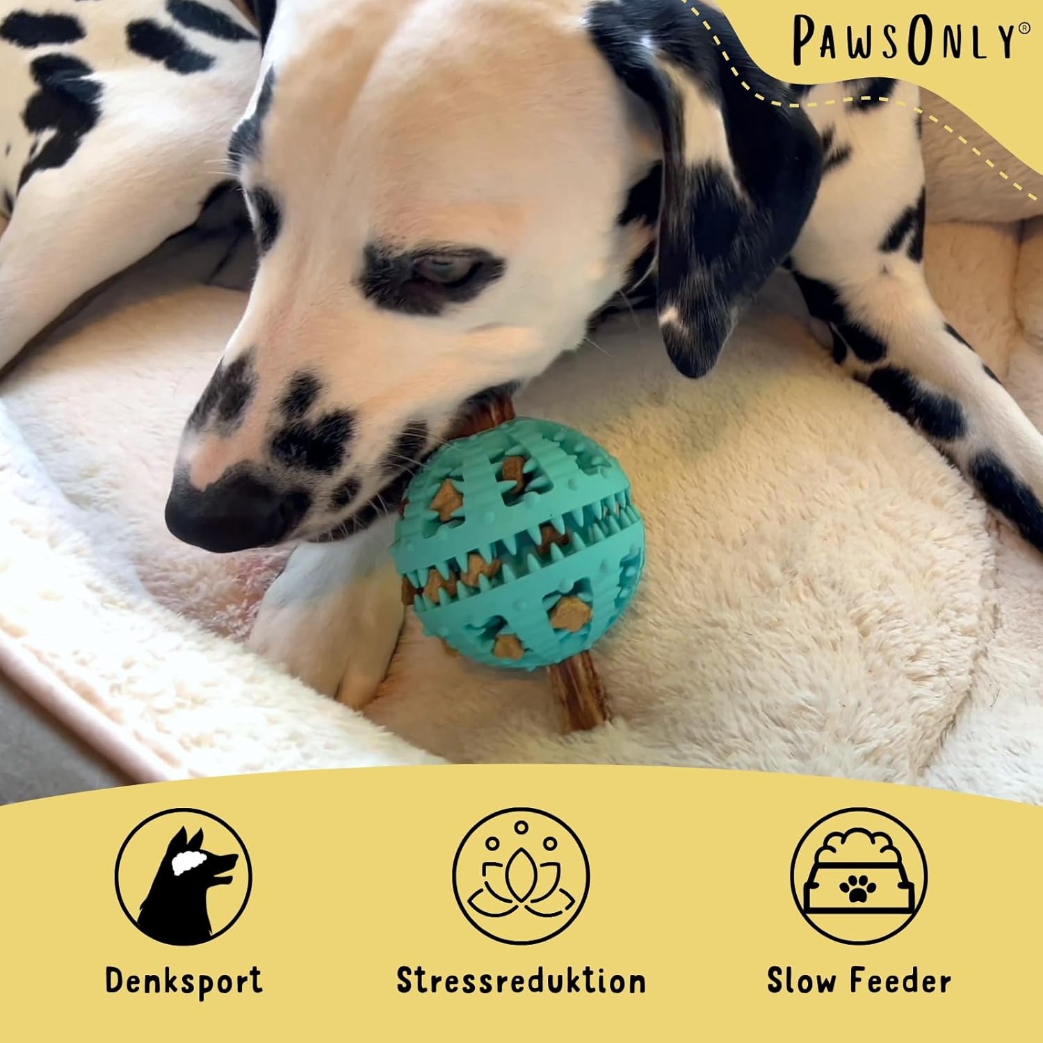 Teeth care when playing: The PawsOnly feeding ball has soft nubs that gently massage the gums when playing and help reduce plaque and tartar – without additional effort. Snacks and dry food fit into the side slots, while dental care sticks can be inserted into the opening in the middle for extended play fun and supportive dental care.
