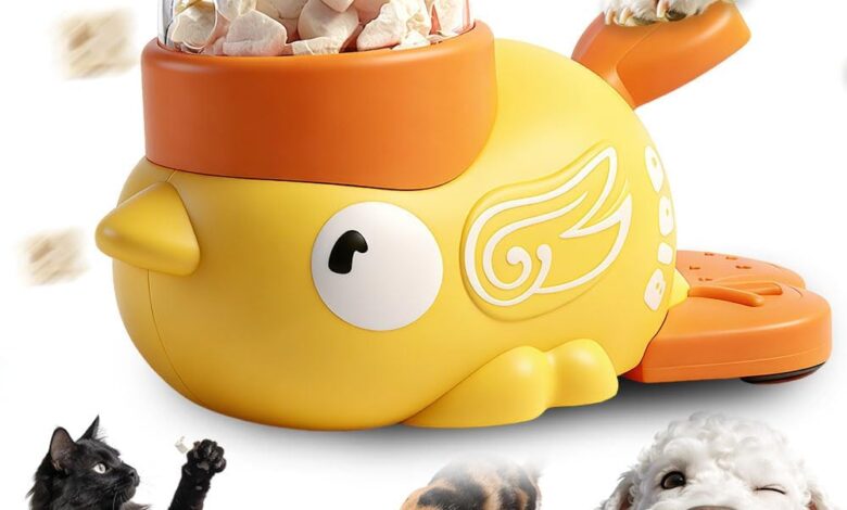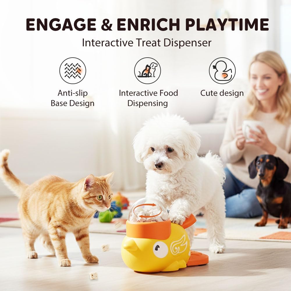 Duck shape slow feeder dog: Our interactive dog feeder with original duck shape helps slow food intake and promotes healthy eating habits. Simply press the tail – the dog food bin distributes the dry food evenly. Prevents hasty eating, vomiting and bloating. Ideal for dogs and cats of all sizes.