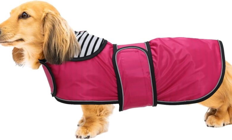 Geyecete Dog Raincoat, Adjustable Waterproof Dog Jacket for Dachshund, Raincoat with Reflective Straps, Rain Jackets with Belt with Fastening for Miniature Dachshund Pink, XS