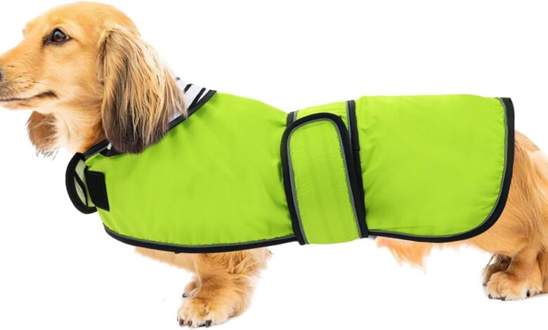 Geyecete Dog Raincoat, Adjustable Waterproof Dog Jacket for Dachshund, Raincoat with Reflective Straps, Rain Jackets with Belt with Velcro Fastener for Miniature Dachshund, Green, M