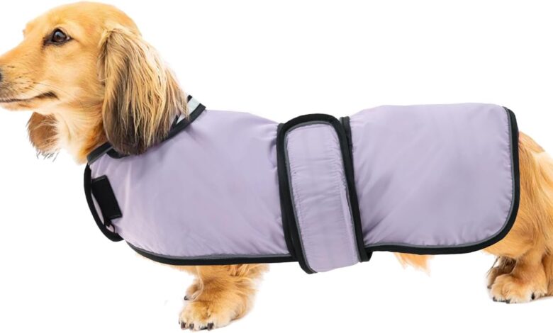 Geyecete Dog Raincoat, Adjustable Waterproof Dog Jacket for Dachshund, Raincoat with Reflective Straps, Rain Jackets with Belt with Velcro Fastening for Miniature Dachshund Purple M