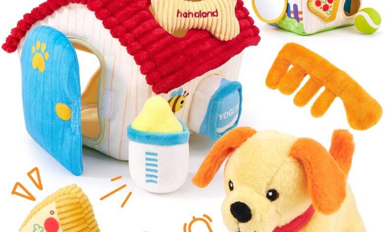 hahaland Plush Dog Baby Toy Set for Ages 6, 8, 9, 10 Months, Montessori Dog House Design with Rattle Mirror & Shapes, Sensory Baby Toy, Learning & Role Play, Gift Toy from 1 2 3 Years