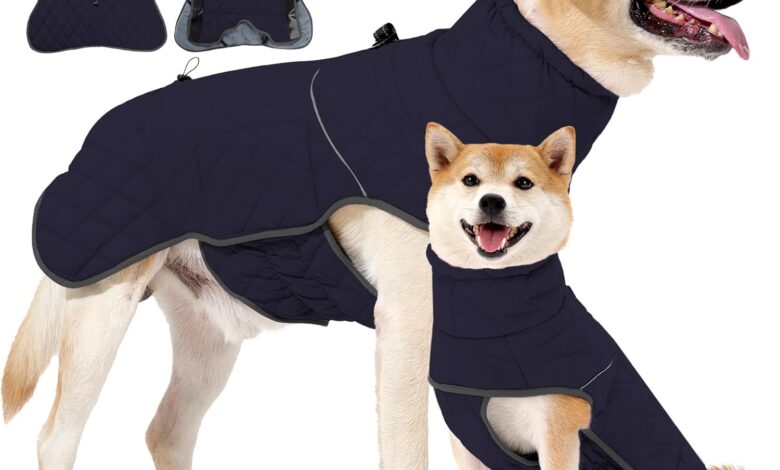 **REFLECTIVE STRIPS FOR NIGHT SAFETY**: Equipped with reflective stripes, this waterproof dog jacket improves visibility during night walks and ensures your furry friend is safe in dimly lit conditions. The dog coat is equipped with elastic rear leg loops that keep the coat close to the body when running and playing.