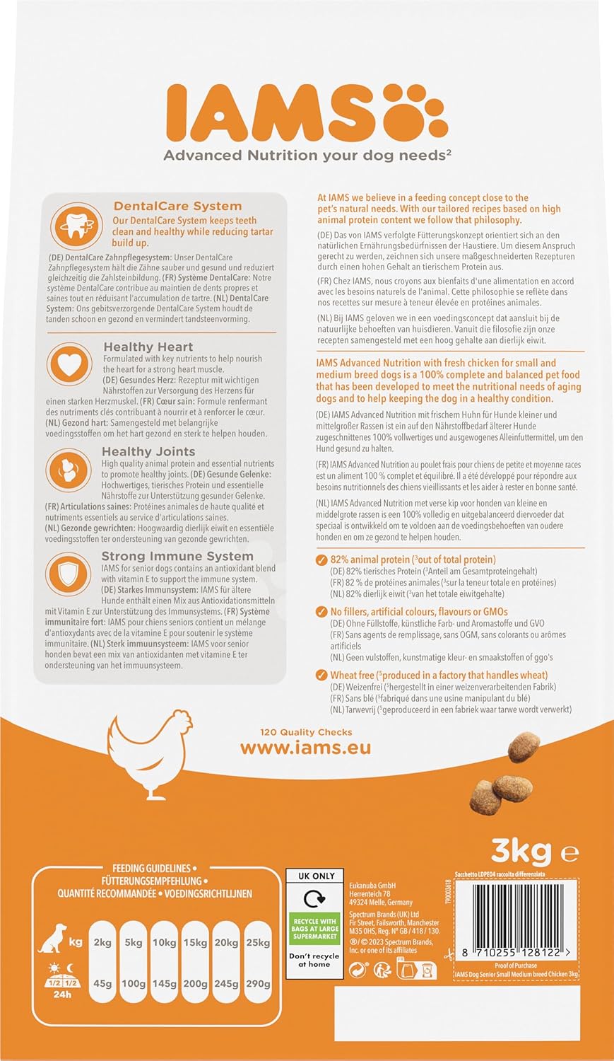 Box contents: 1 x 3 kg dry food for small and medium senior dogs with fresh chicken, made in the Netherlands with over 120 quality controls, wheat free, without fillers, artificial colours and flavourings and GMOs
