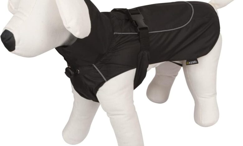 With drawstring in the neck area, elastic belly bib, freely adjustable collar with elastic insert, rubber leg loops on the hind legs