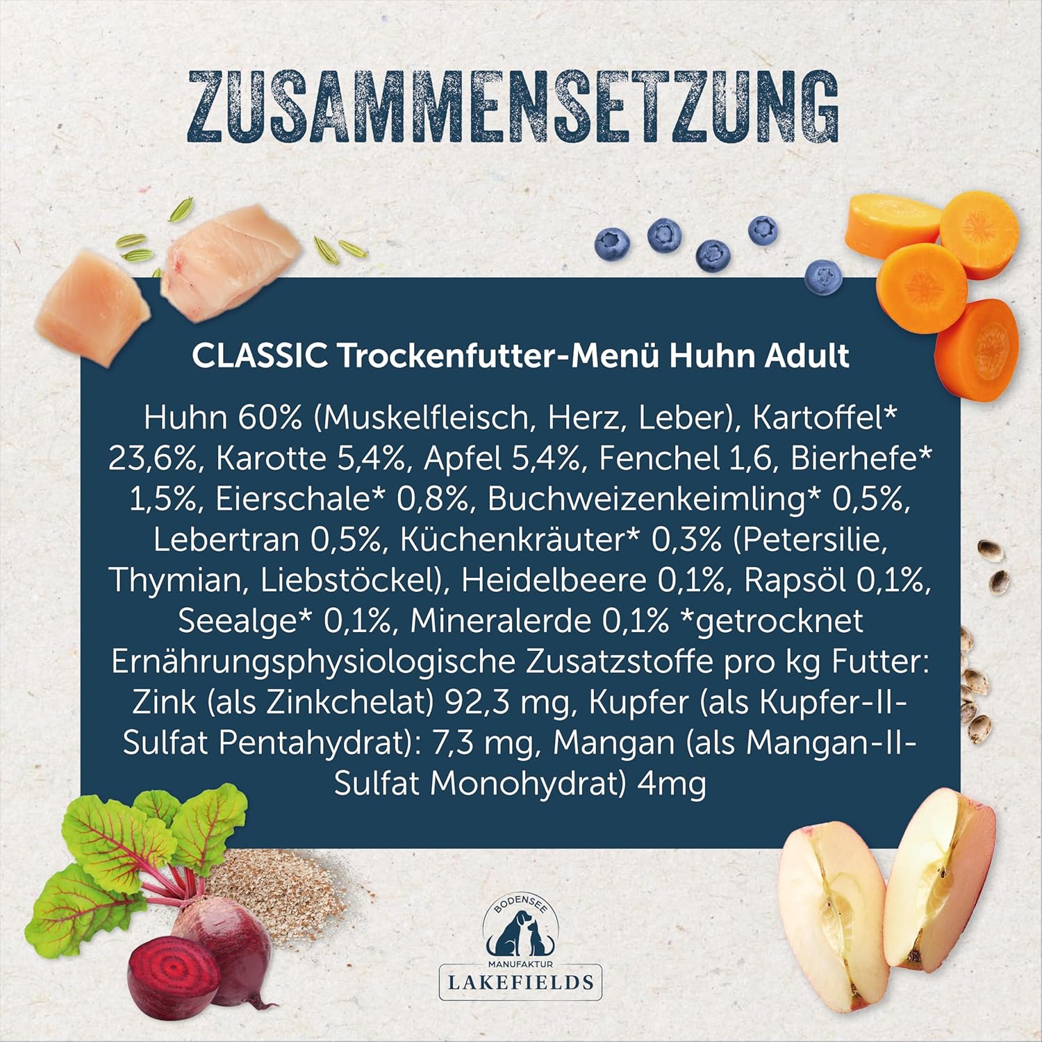 Lakefields Classic Dry Dog Food, Chicken 60%, 2.5 kg, Grain-Free Dry Food for Adult Dogs, Food Grade Ingredients, Fennel, Carrots & Potatoes, Gently Baked