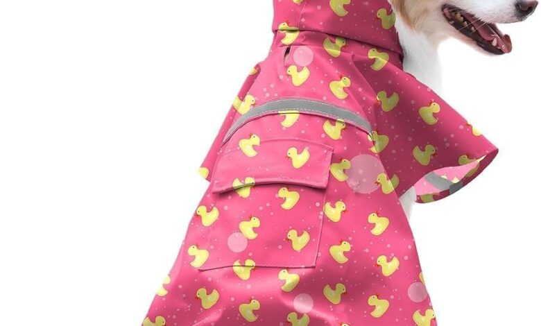 Large Dog Raincoat Duck Pattern Adjustable Waterproof Lightweight Rain Jacket Poncho Hoodies with Reflective Stripes, Peach, M