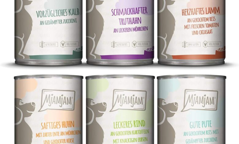 MjAMjAM – Premium wet food for dogs – Mix package II – with chicken & duck, beef, turkey, veal, turkey, lamb, 6-pack (6 x 400 g), grain-free with extra meat
