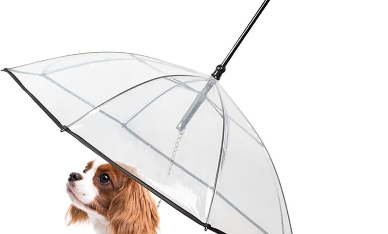 Size: Adjustable dog shield length 20.9-23.8 inches (52-60.4 cm); opening dog umbrella diameter 28.3 inches (71.8 cm); built-in pet umbrella lead 12.2 inches (31 cm).