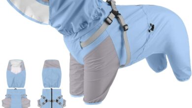Dog Raincoat, Waterproof Dog Jacket with Removable Hood and Elastic, Adjustable Buckles, Lightweight and Vibrant 4 Legs Pet Rain Jacket with Breathable Mesh and Hole