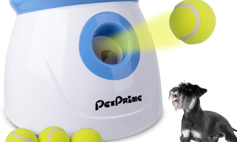 Pet Prime Automatic Ball Throwing Machine for Dogs with 3 Distances (3 m – 9 m) Includes 3 Robust Tennis Balls (5 cm) Ideal for Small Dogs (Mini Launchers)