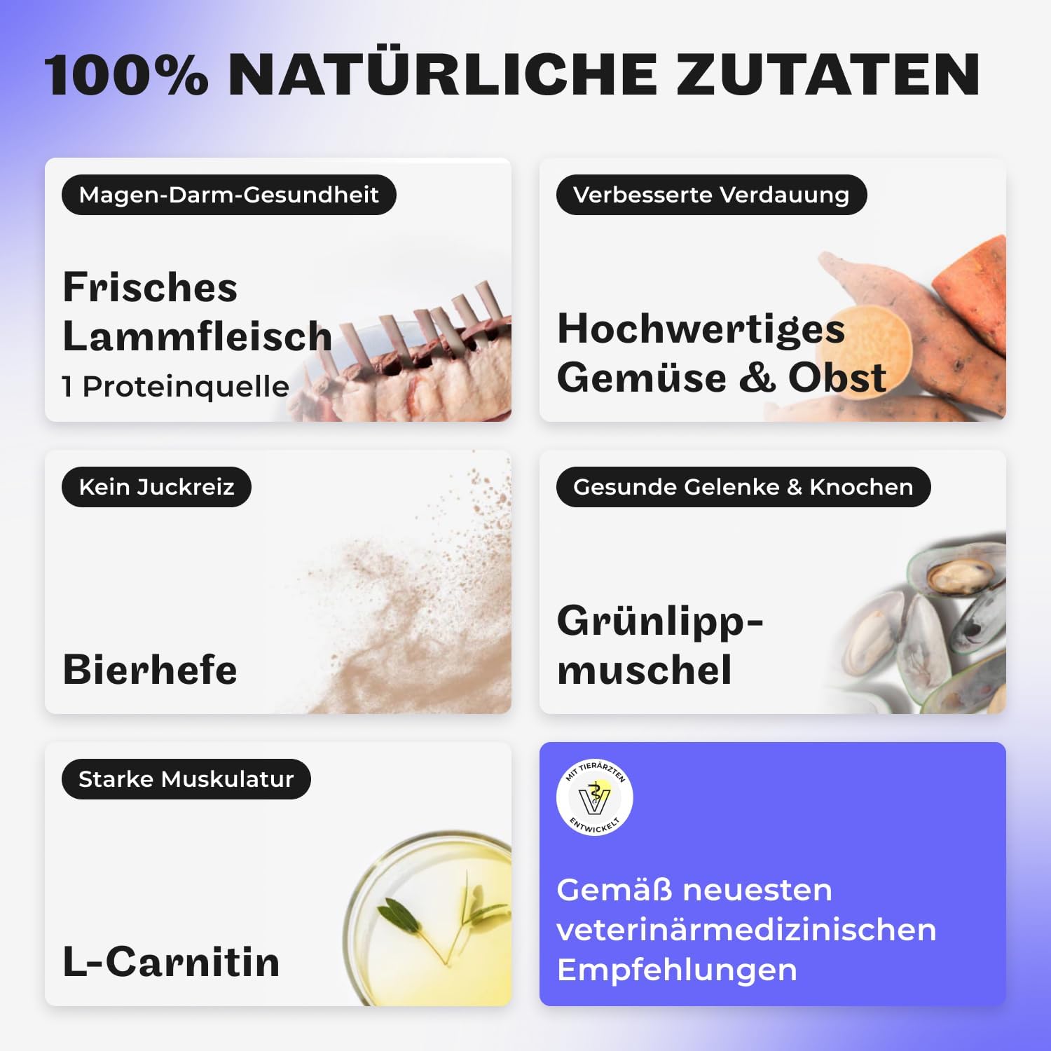 Nutrient-rich: fresh lamb meat as the only source of protein, high-quality fruit and vegetables promote gastrointestinal health and can prevent breed-typical weight and joint problems.