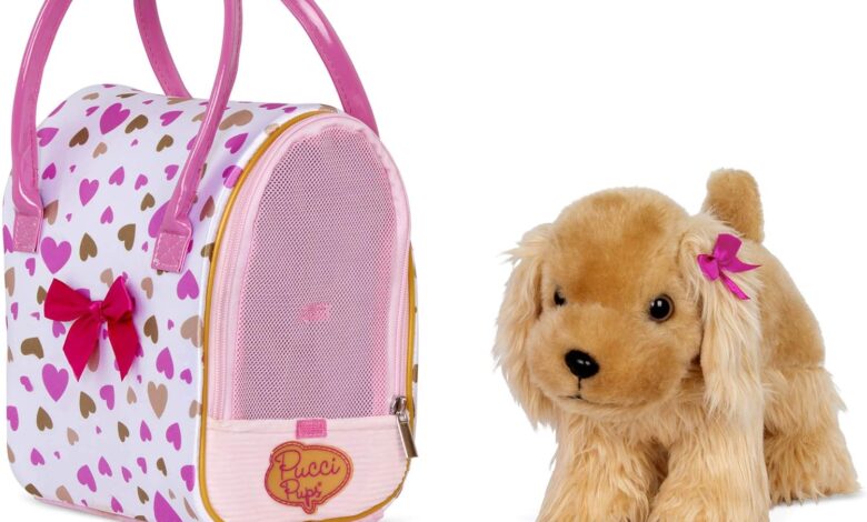 Pucci Pups – Pink & Golden Heart Print Bag with Cocker Spaniel – Toy Dog – Plush Puppy – Dog Transporter – Toy Cocker Spaniel – 3 Years +