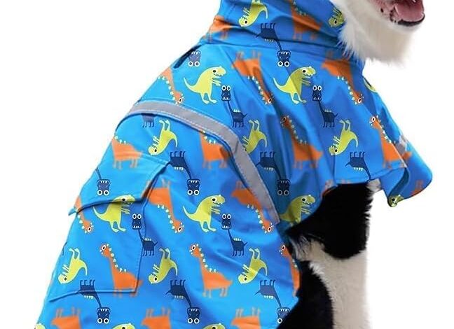Raincoat for Large Dogs Dinosaur Adjustable Waterproof Lightweight Rain Jacket Poncho Hoodie with Reflective Stripe (Blue Dinosaur, L)