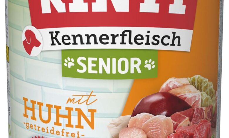 Wet food – This food is ideal for dogs aged 7 and over, for smaller breeds from 8 or 9 years. The amount of food varies depending on the weight and activity of the dog: a 6 kg dog requires about 1/2 can daily, while a 16 kg dog needs approx. 1 tin needs