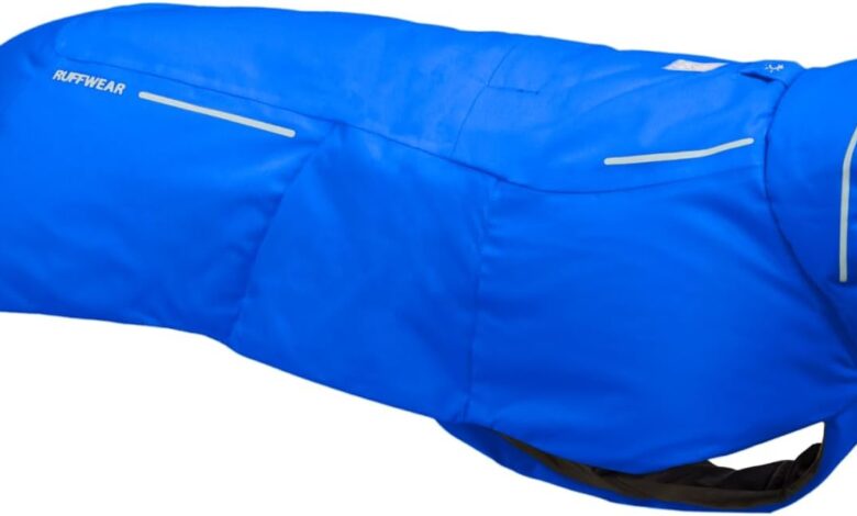 RUFFWEAR Vert Medium Dog Rain Jacket, Insulated All-Weather Dog Coat, Waterproof Dog Jacket, Lightweight Weatherproof Dog Vest and Winter Dog Raincoat, Medium, Blue Pool