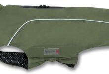 Dogs can keep their pace with the Ruffwear Vert jacket, no matter what kind of cold and wet they face. The medium dog jacket has been specially developed for the winter mix where you would otherwise have to spend the whole day indoors. It features advanced waterproof protection over the hips and thighs and recycled airy insulation that provides exceptional warmth, as well as a fur-repellent lining. Leg loops keep the jacket in place when the wind refreshes, and the canvas portal allows the Vert to be worn over a climbing harness. Part of our range of premium dog accessories and dog clothing for year-round use – so you can enjoy the outdoors together in any weather. Ruffwear Vert Waterproof Dog Jacket for Winter – Color Blue Pool Medium Dog Coat (27 to 32 inches) Waterproof and windproof clothing for dogs. The oversized storm collar folds up for added weather protection. Dog leash portal on the back, compatible with most dog harnesses. The extended dog vest coat covers hips and thighs. Leg loops provide a secure fit in windy conditions. Relaxed fit with side buckles for easy putting on and taking off Good Visible reflective trim and light loop for attaching The Beacon️ (sold separately)