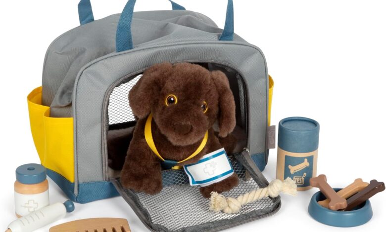 Comprehensive pet set consisting of a plush dog and grooming accessories Includes Dog toy, bowl and treats in resealable tin, comb, tweezers, bandage with Velcro fastener, syringe and medicine bottle Encourages creative role play and trains important social-emotional skills Feeding, care, play, doctors – the extensive set opens up a wide range of game scenarios Bag approx. 26 x 15 x 18 cm, dog approx. 12 x 15 x 14 cm