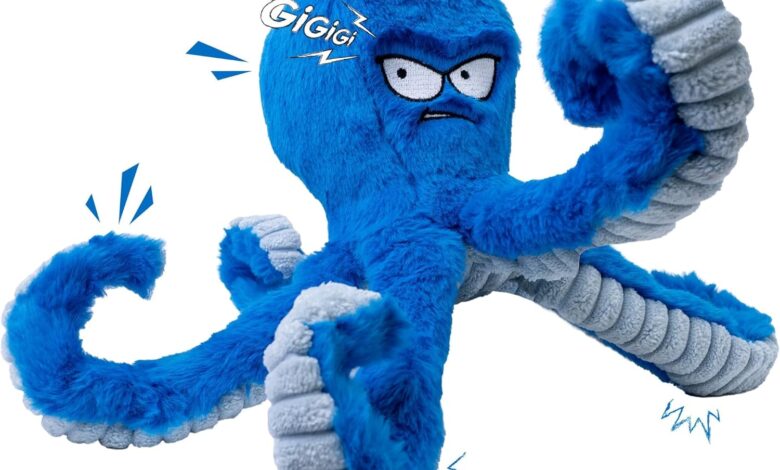 Funny Dog Chew Toy: cute angry octopus, vivid blue dog toy. This super fun large dog toy has a squeaker in the head and crackling paper in 6 tentacles. Squeaks and crackles provide a wonderful sound enjoyment. The highly elastic tentacles provide maximum tug of war pleasure, while the sound attraction and dynamic changes will keep your pet busy for hours. The squeaky dog toy is the ultimate toy for your furry friend and no dog can resist it!