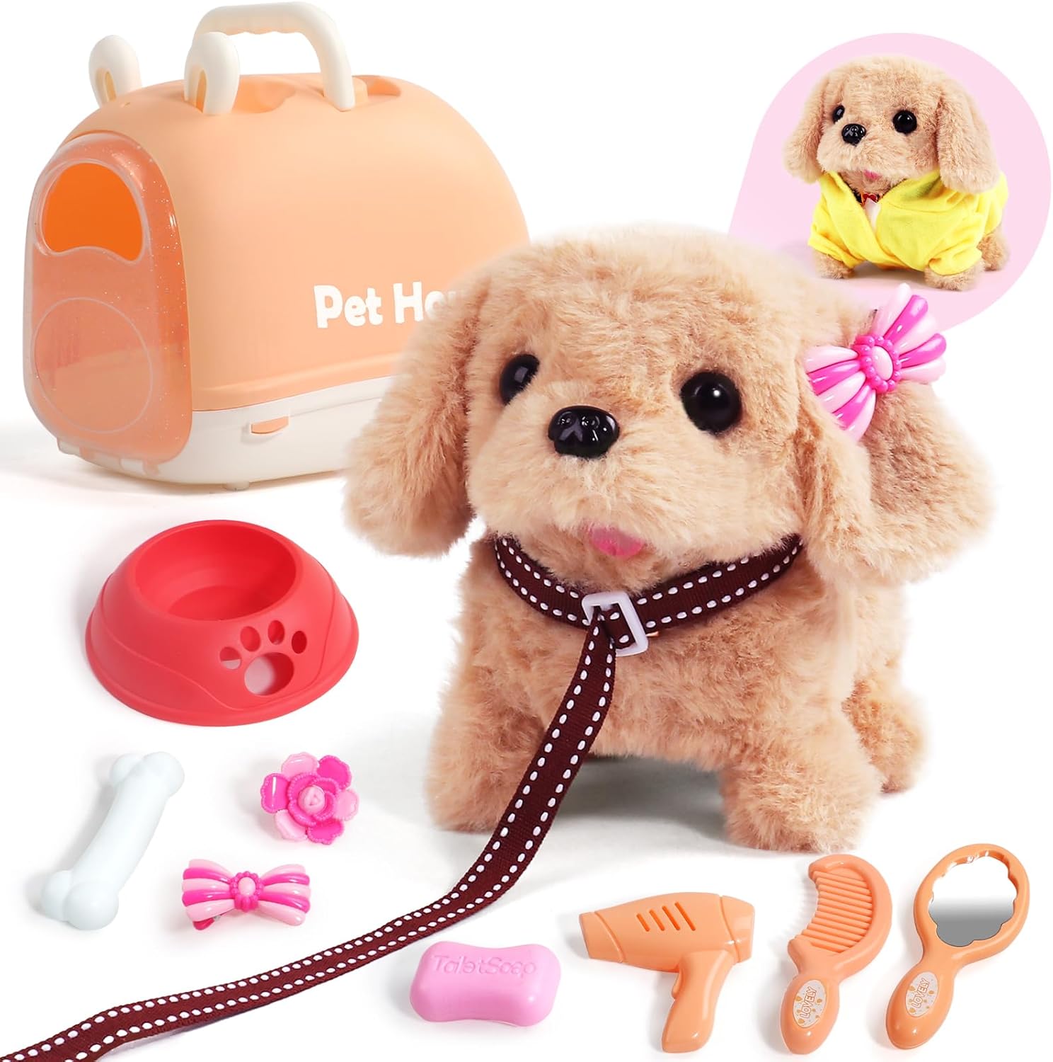 TONZE Dog Toy Children’s Toy Girls from 2 3 Years Dog with Lead for Running and Barking, Cuddly Toy Dog, Small Toy Dog Set (Cape & Hairpin) Dog Game Girl Toy 2 Years