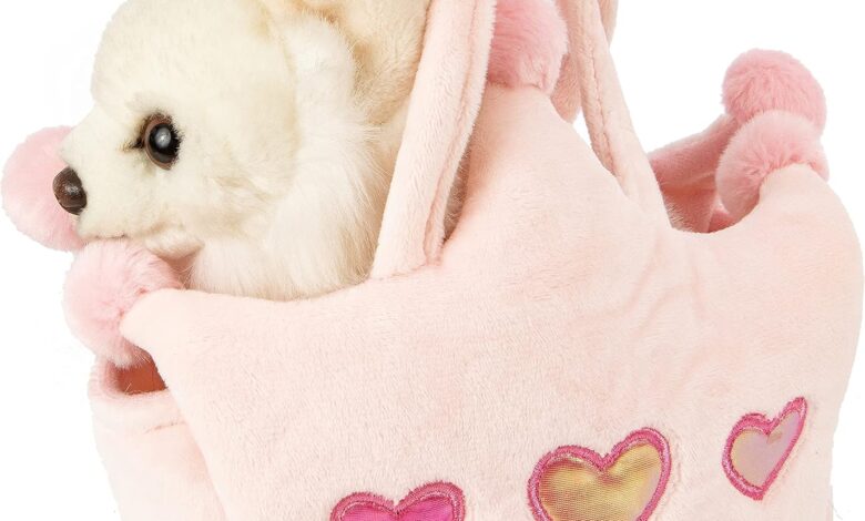 - The cute dog made of fluffy soft plush sits in an extravagant, pink handbag.