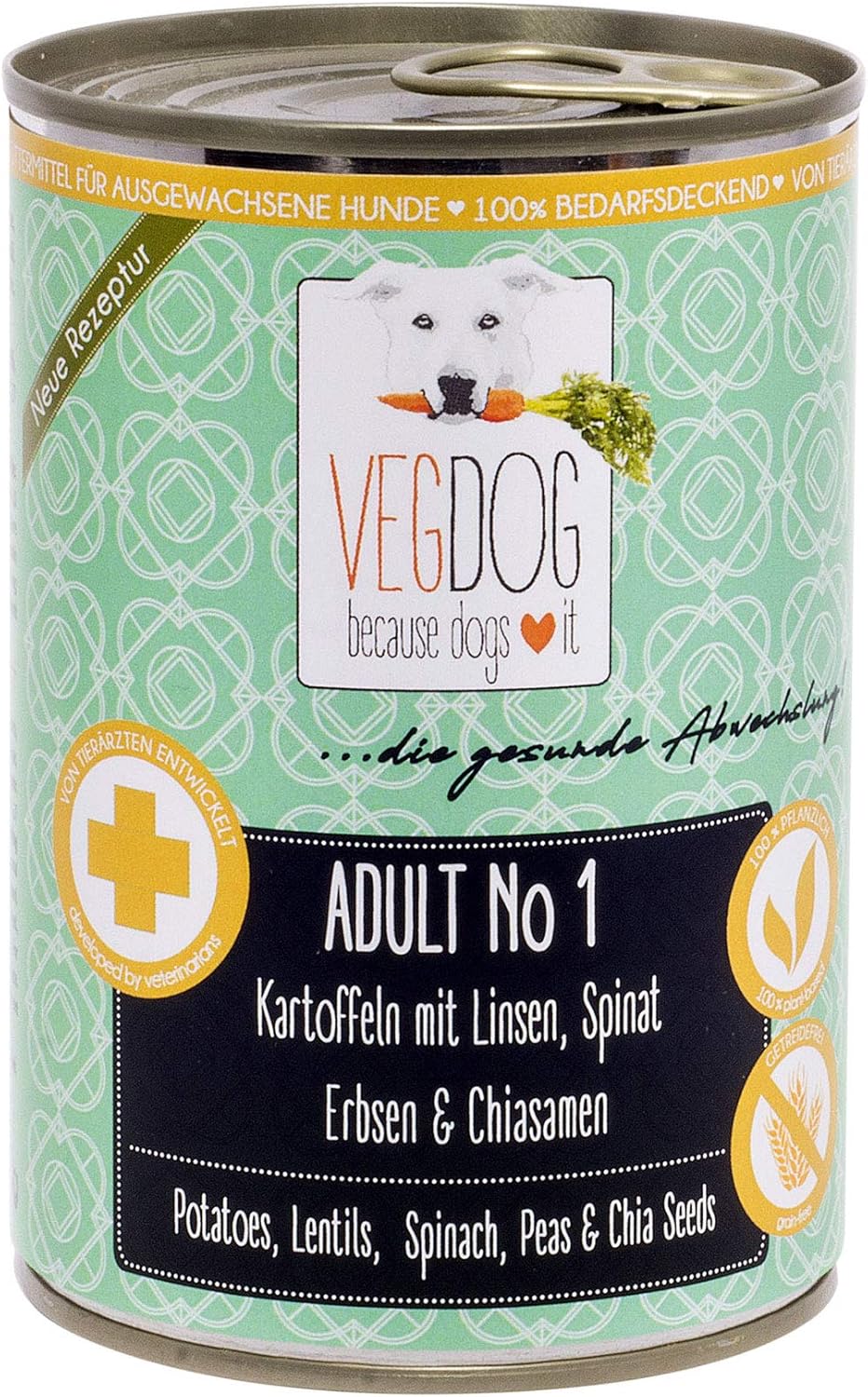 100% vegan – well digestible complete food with alternative protein source for adult dogs from 12 months, suitable for all breeds and sizes. With delicious vegetables such as potatoes, lentils, millet, spinach and chia seeds.